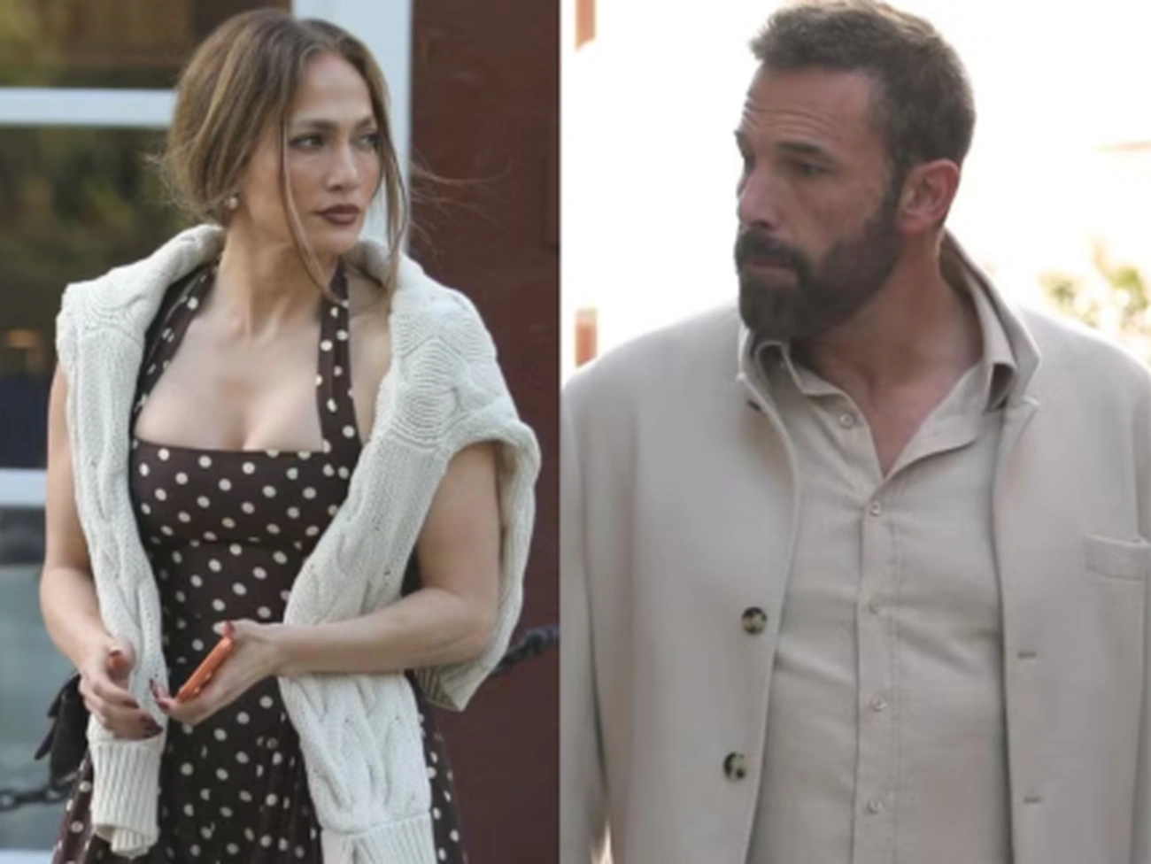 A cantora usava um vestido marrom de bolinhas, combinado com um casaco branco. As imagens chamaram atenção por mostrarem a convivência entre os dois mesmo após o fim do casamento, incluindo a relação mantida com os familiares. Jennifer Lopez e Ben Affleck se conheceram no início dos anos 2000, no set do filme Contato de Risco. Na época, a cantora era casada com o dançarino Cris Judd, mas o envolvimento com Affleck ganhou repercussão rapidamente. O relacionamento foi assumido publicamente em 2002, período em que o ator também participou do videoclipe da música Jenny from the Block.